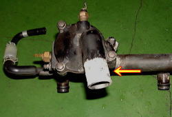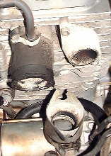 冷却ホース取付部 冷却液も古くなると防錆力が落ち ホースの取り付け部が真っ白に腐食している。もちろん スチールのパイプ内部やエンジン内部も錆びてくる」。 |